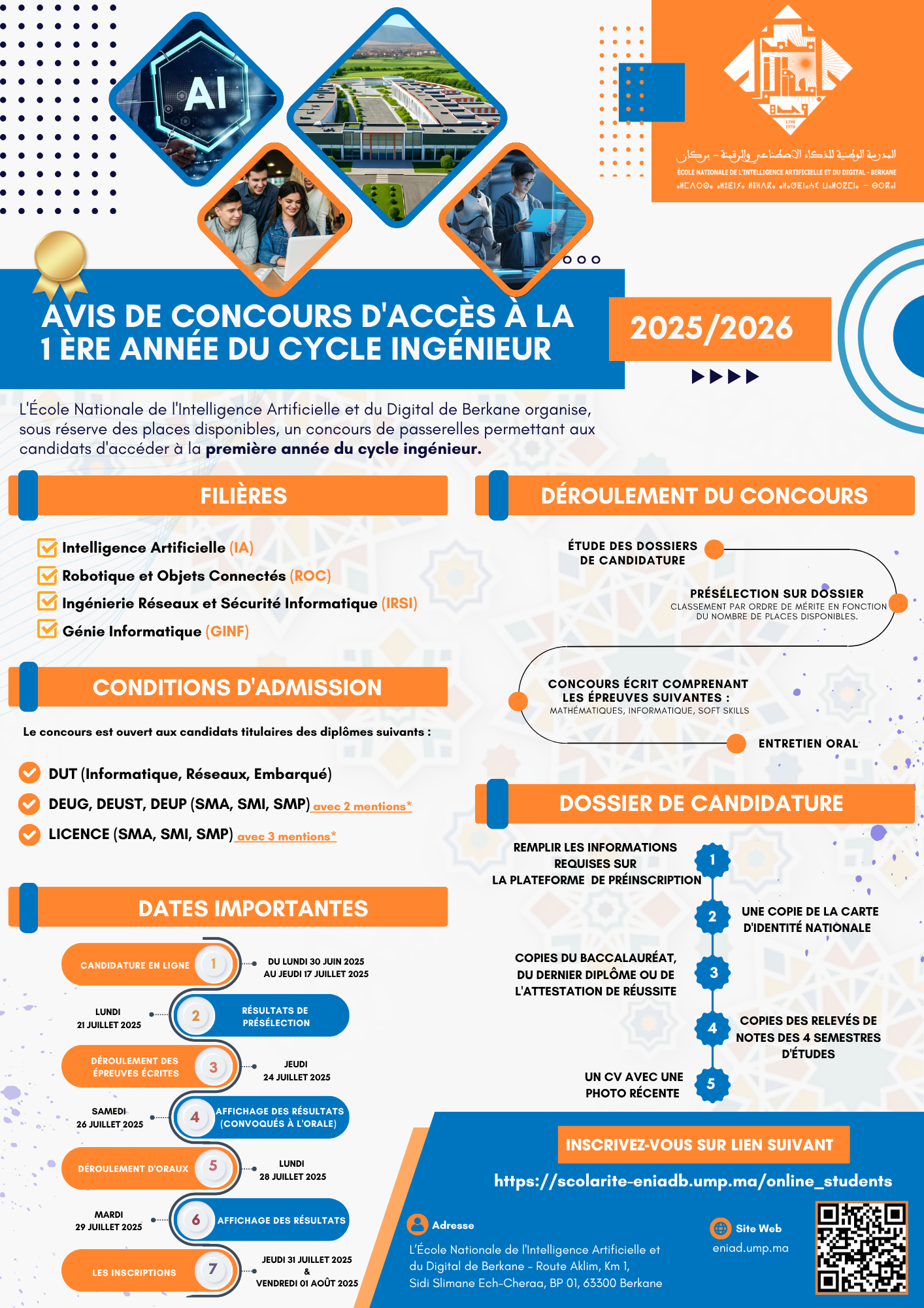 L'École Nationale de l'Intelligence Artificielle et du Digital Berkane organise, sous réserve des places disponibles, un concours de passerelles permettant aux candidats d'accéder à la première année du cycle ingénieur 2025/2026.