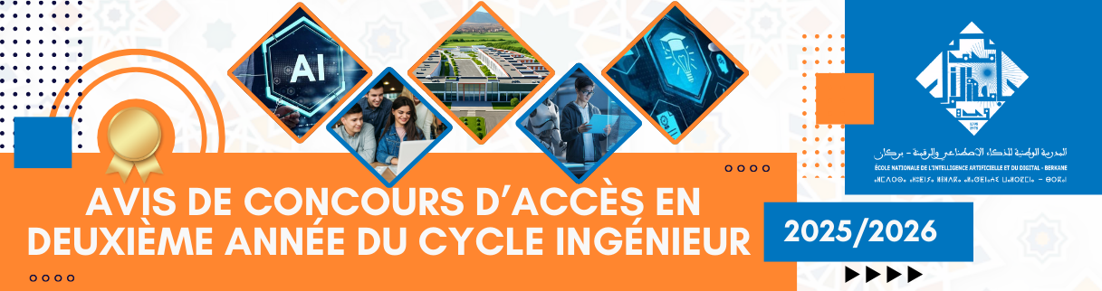 L'École Nationale de l'Intelligence Artificielle et du Digital Berkane organise, sous réserve des places disponibles, un concours concours d’accès en deuxième année du Cycle Ingénieur – Année Universitaire 2025-2026.