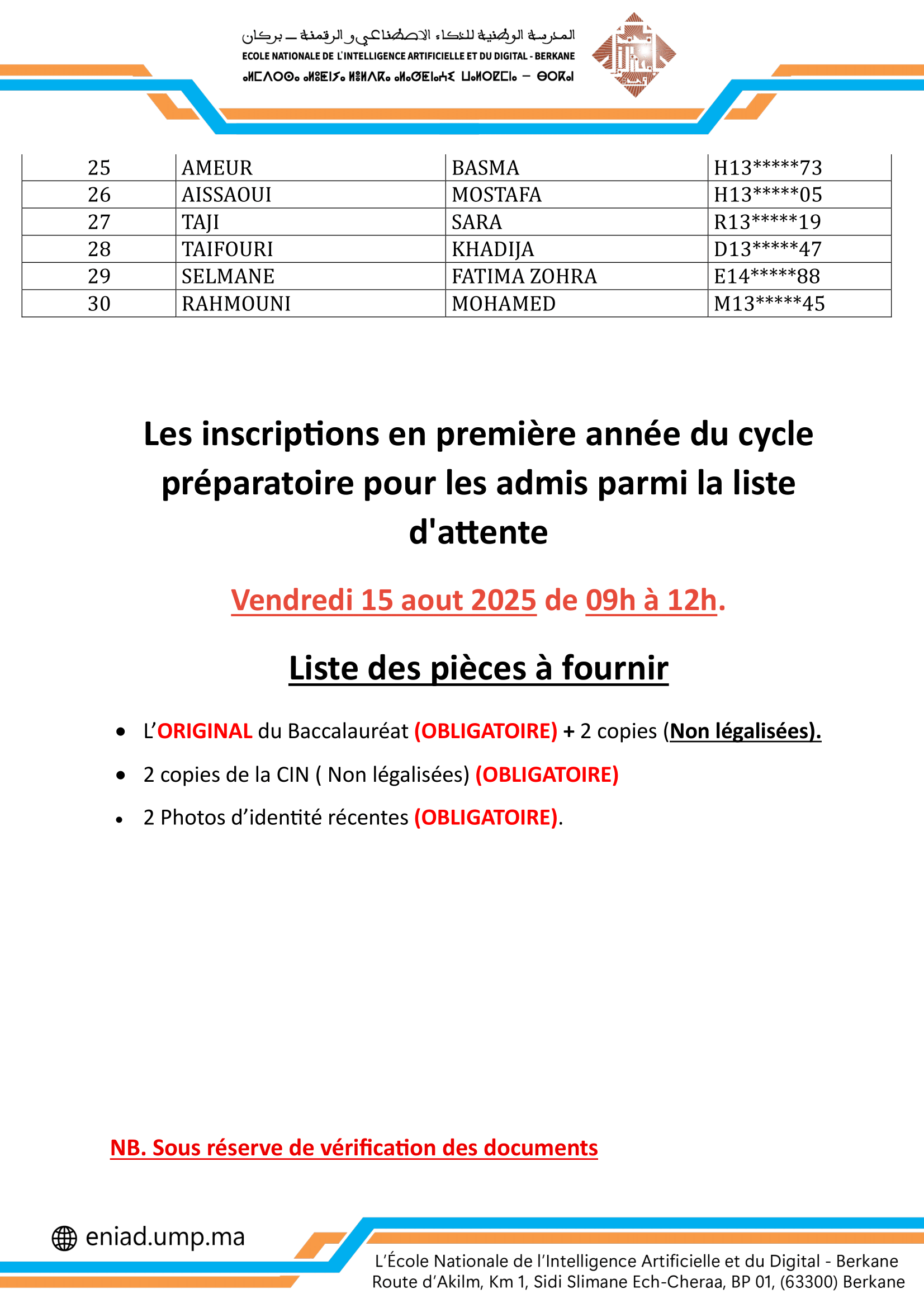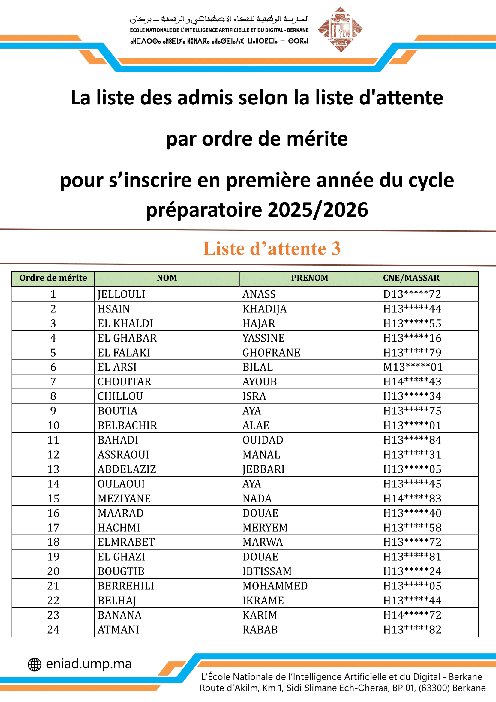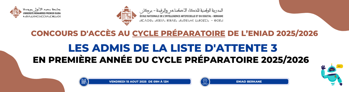 Les admis de la liste d'attente 3 - concours d’accès en 1ère année du cycle préparatoire 2025/2026