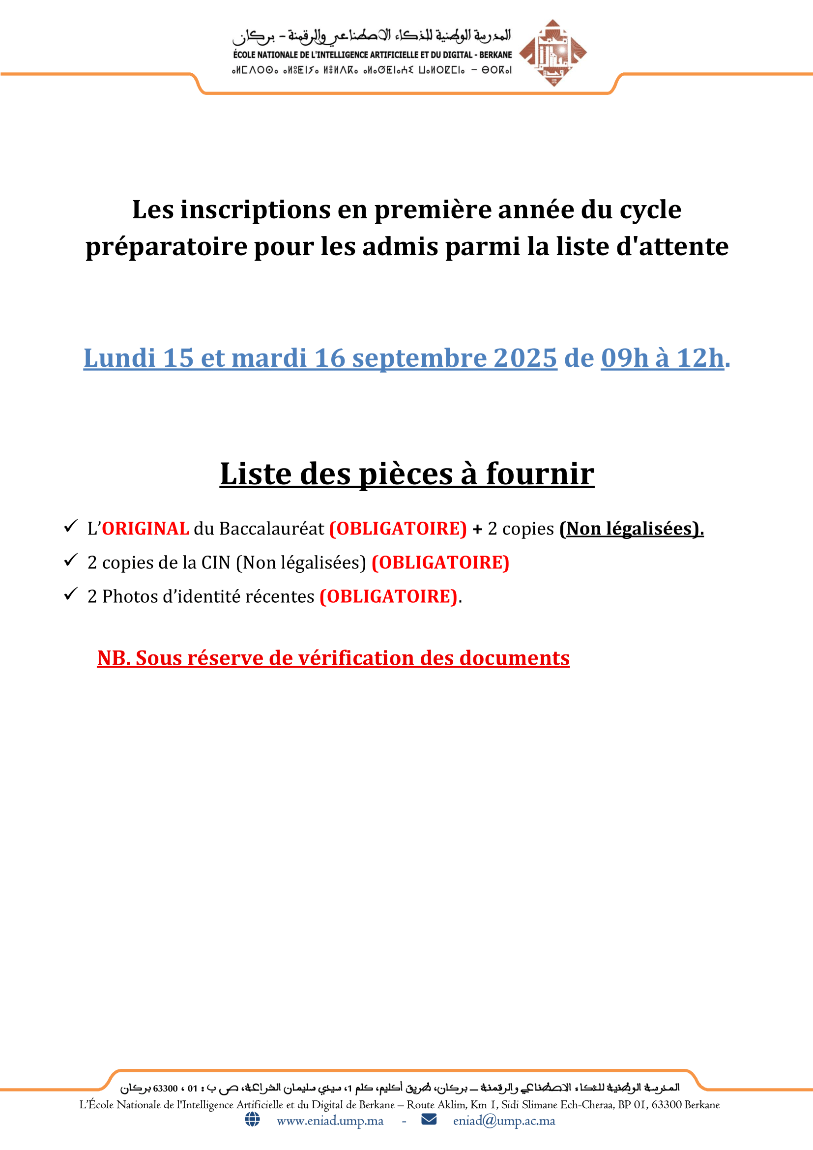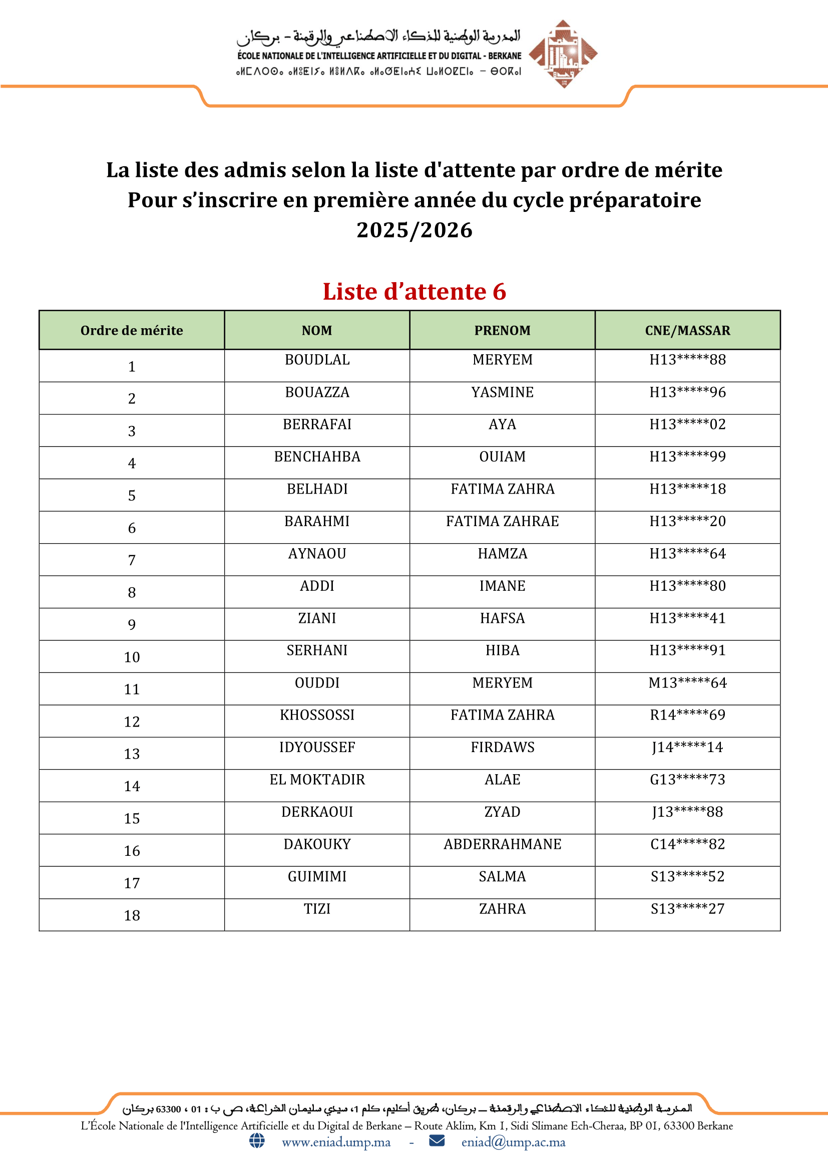 Les admis de la liste d'attente 6 - concours d’accès en 1ère année du cycle préparatoire 2025/2026