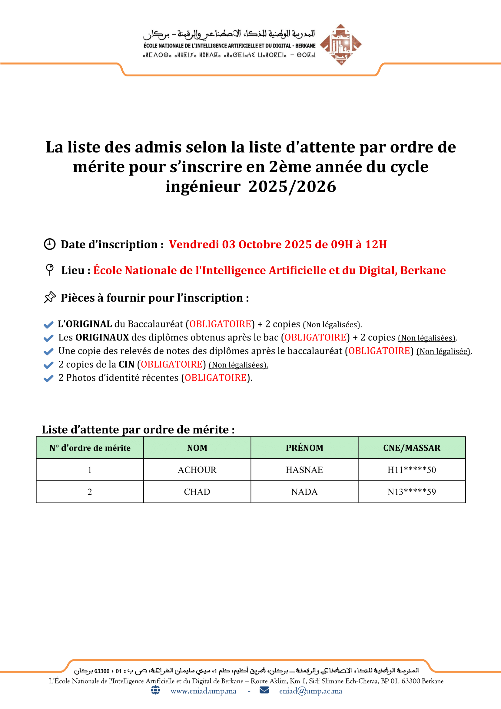 Les admis de la liste d'attente - concours d’accès en deuxième année du cycle ingénieur 2025/2026