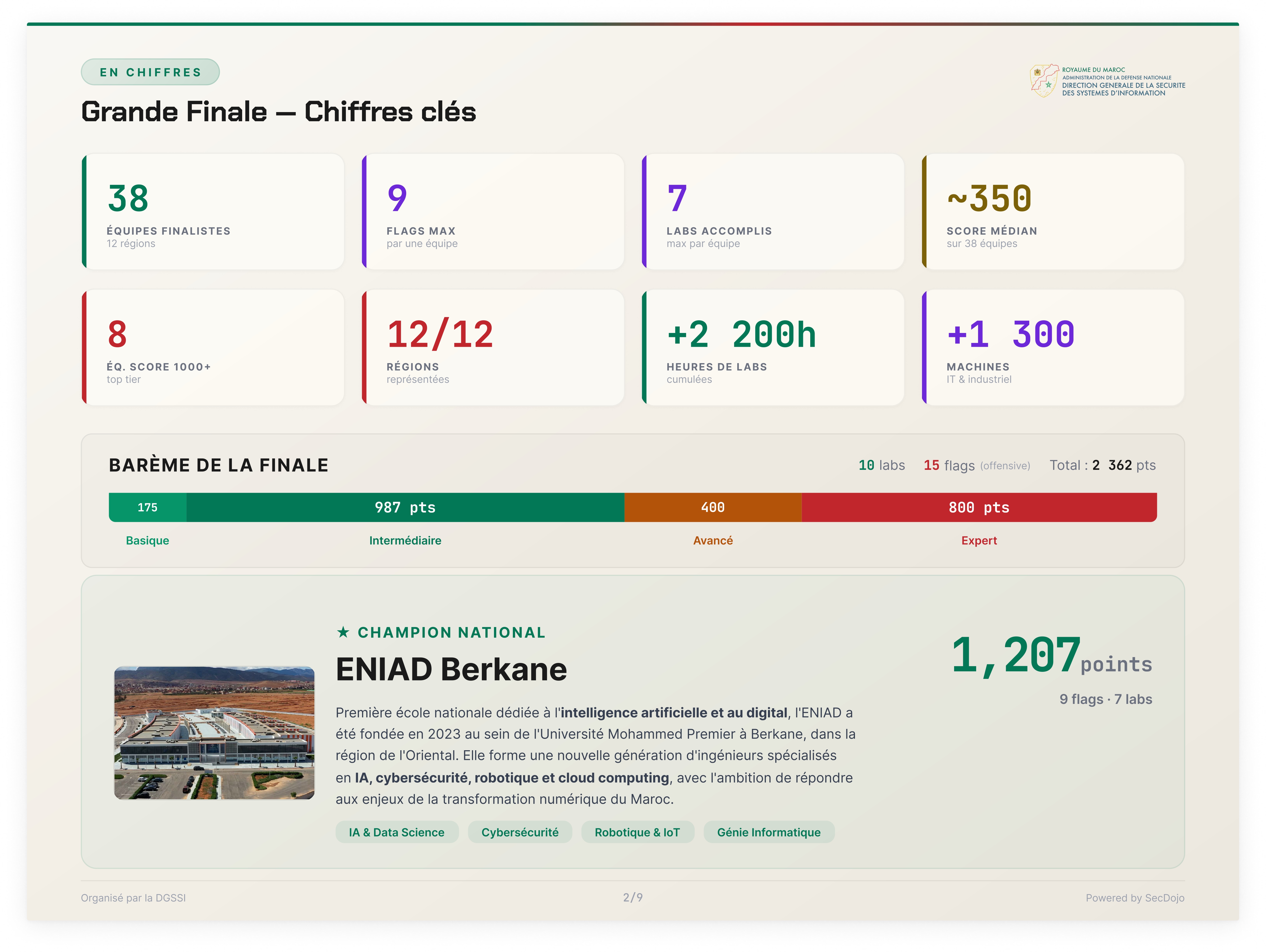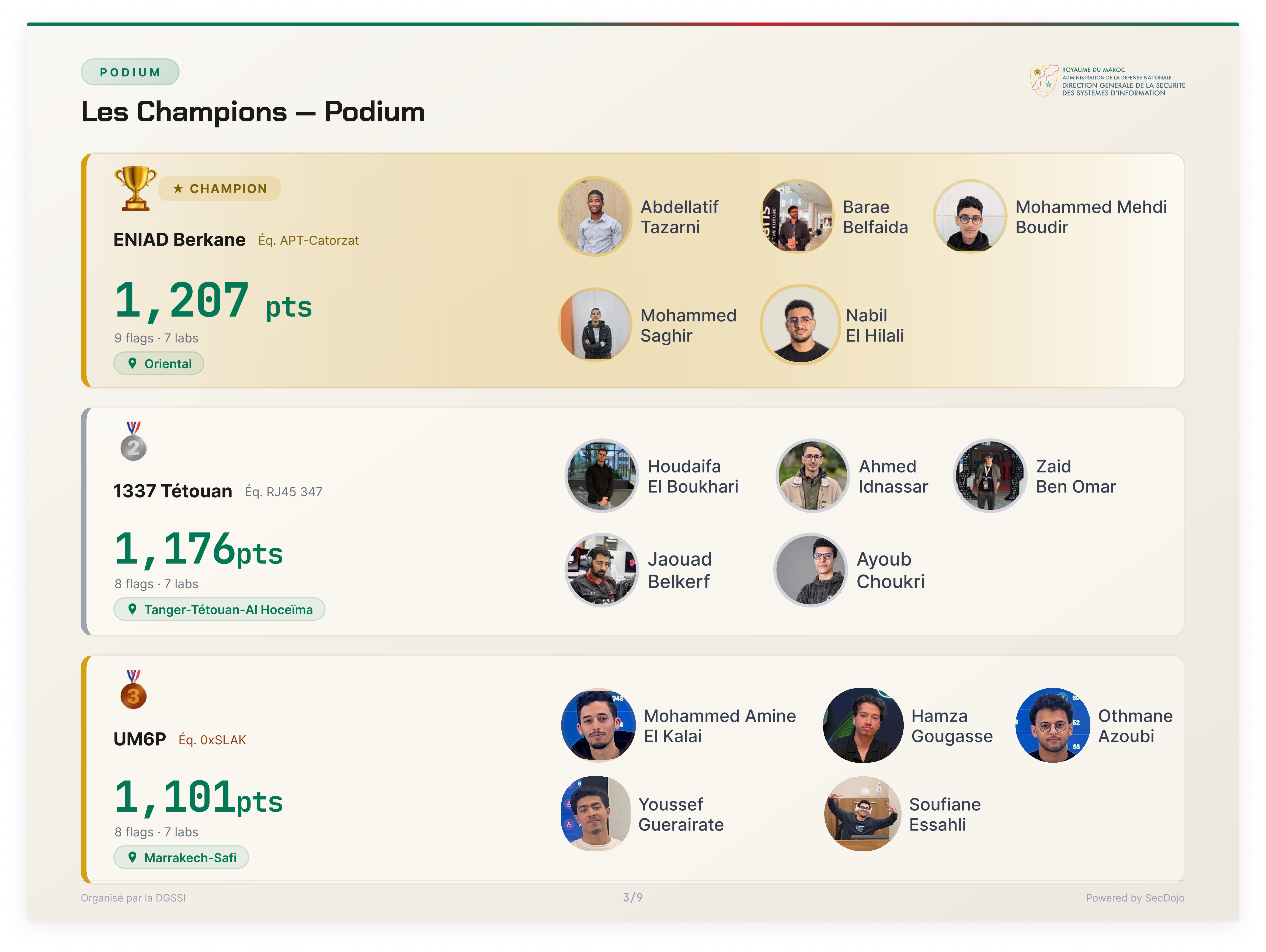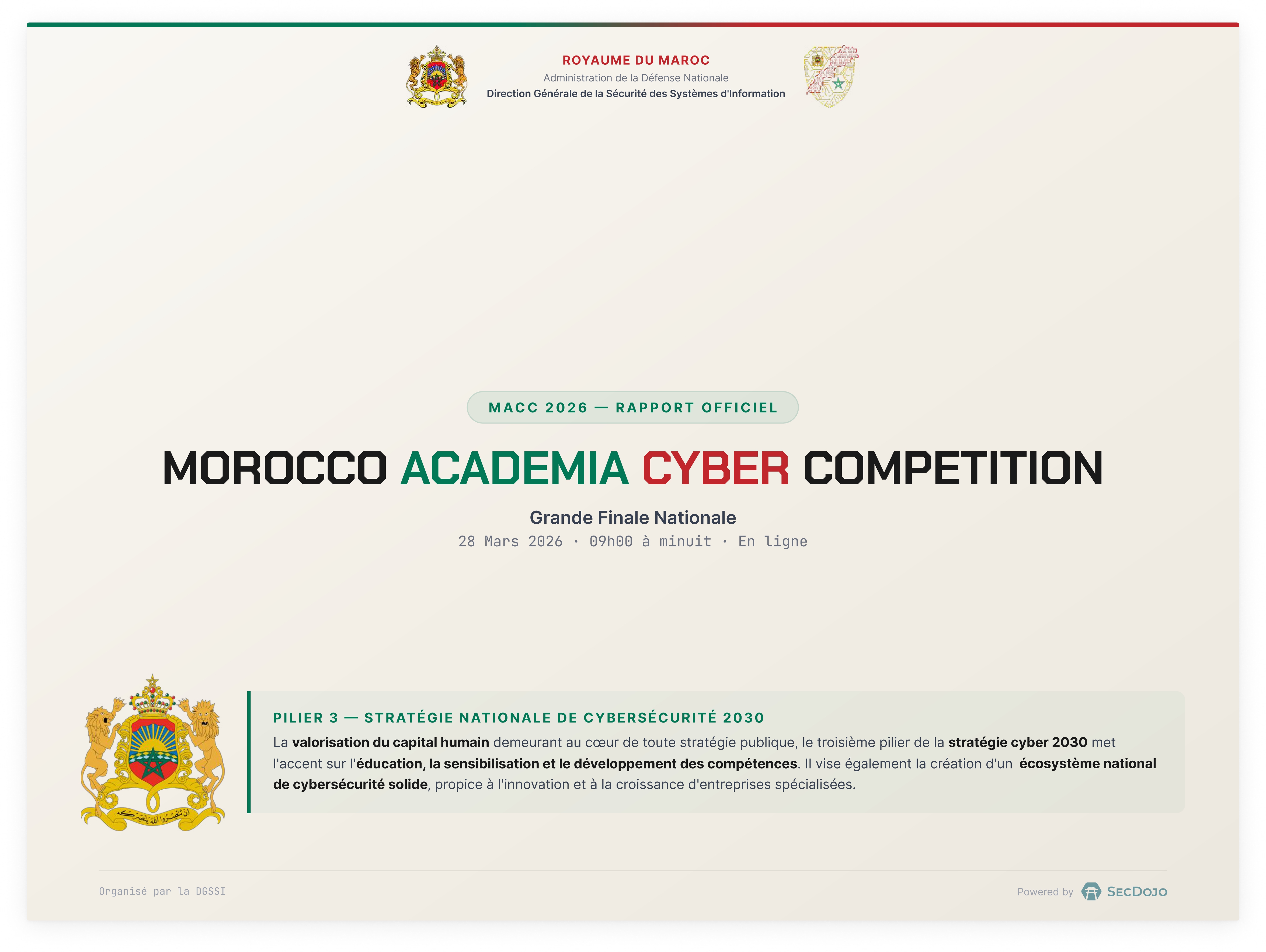 Nous remercions chaleureusement la Direction Générale de la Sécurité des Systèmes d'Information (DGSSI) pour l'organisation de cette compétition de très haut niveau qui met en lumière les talents cyber marocains.