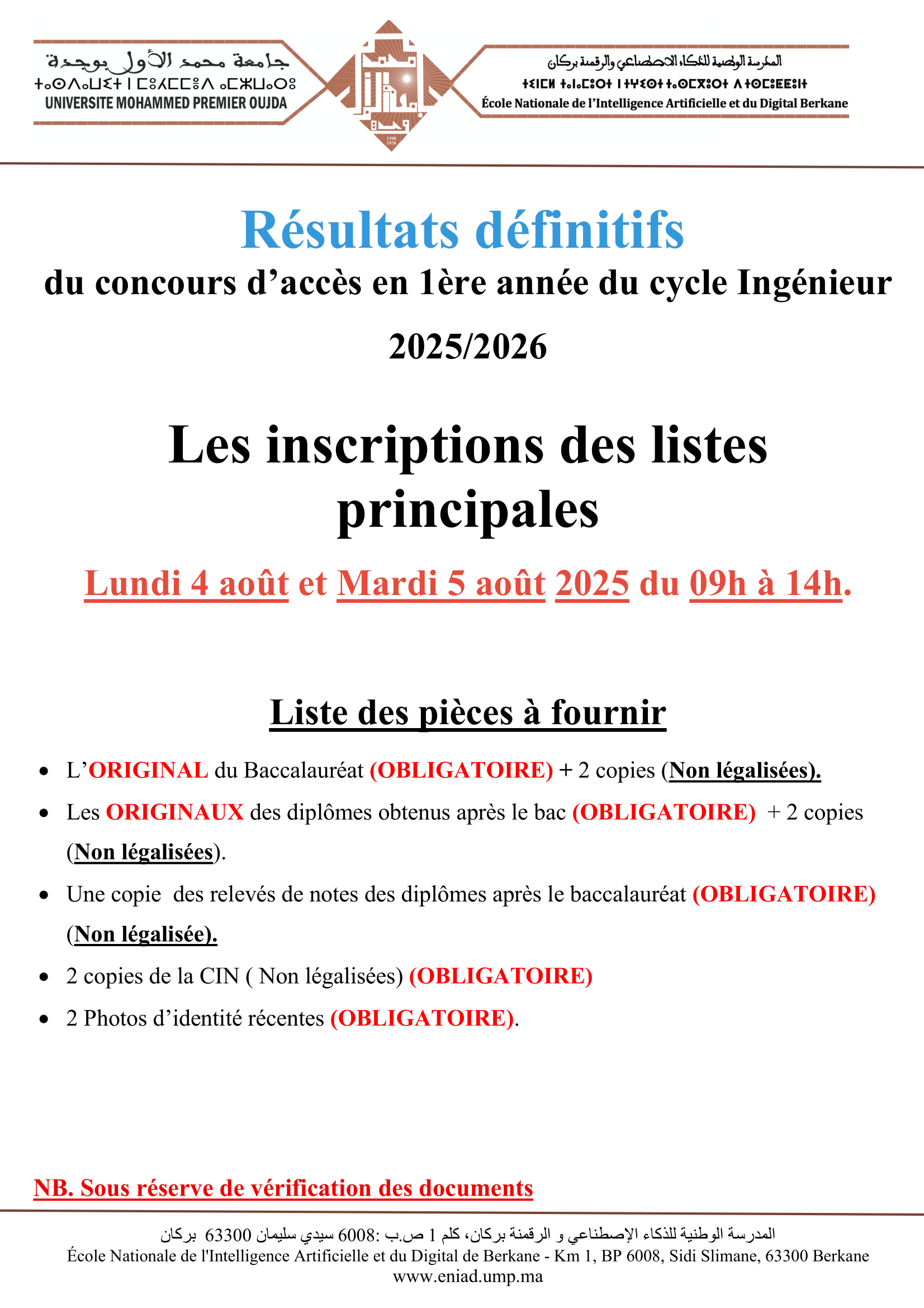 Résultats définitifs - Liste des candidats admis en première année du cycle ingénieur 2025/2026 |