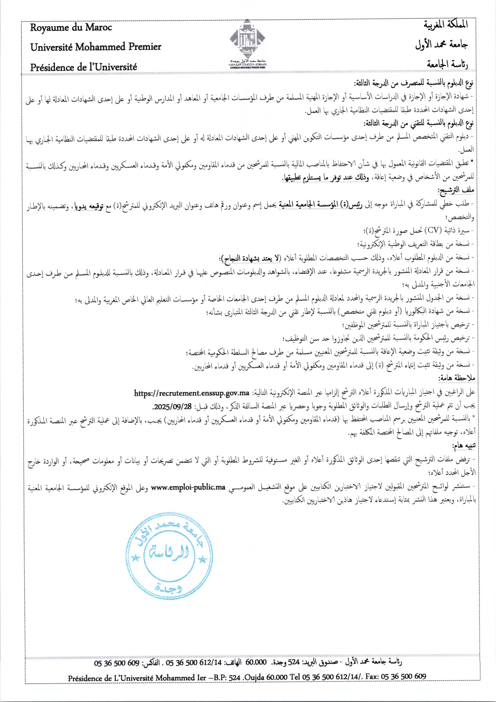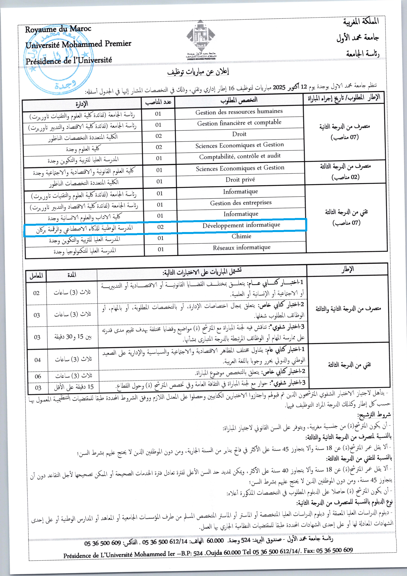 Avis de concours pour le recrutement des cadres administratifs et techniques (Session 12/10/2025)