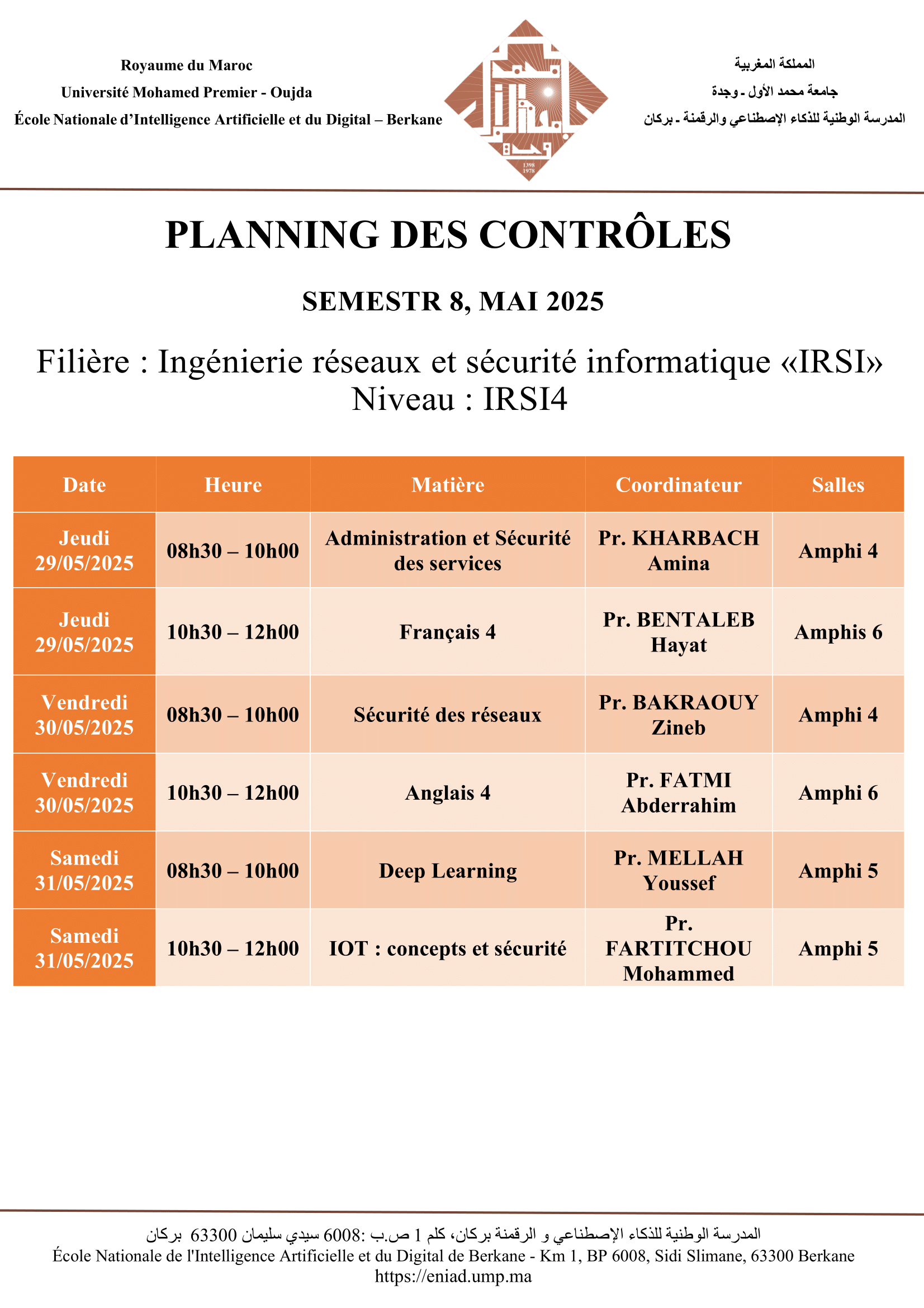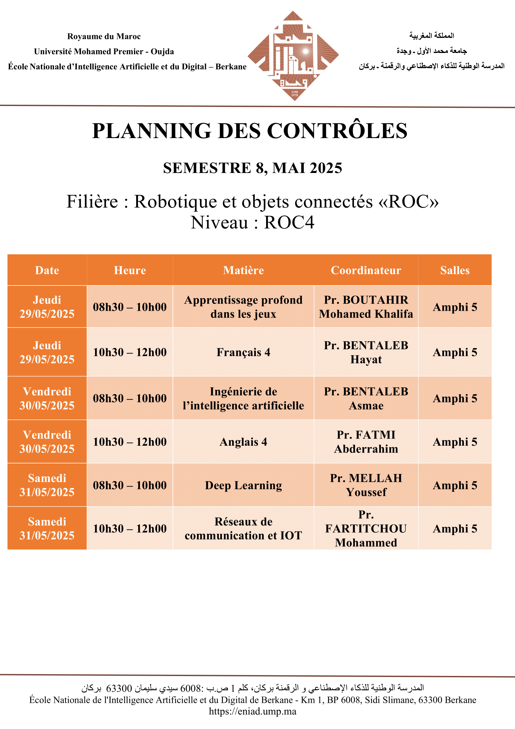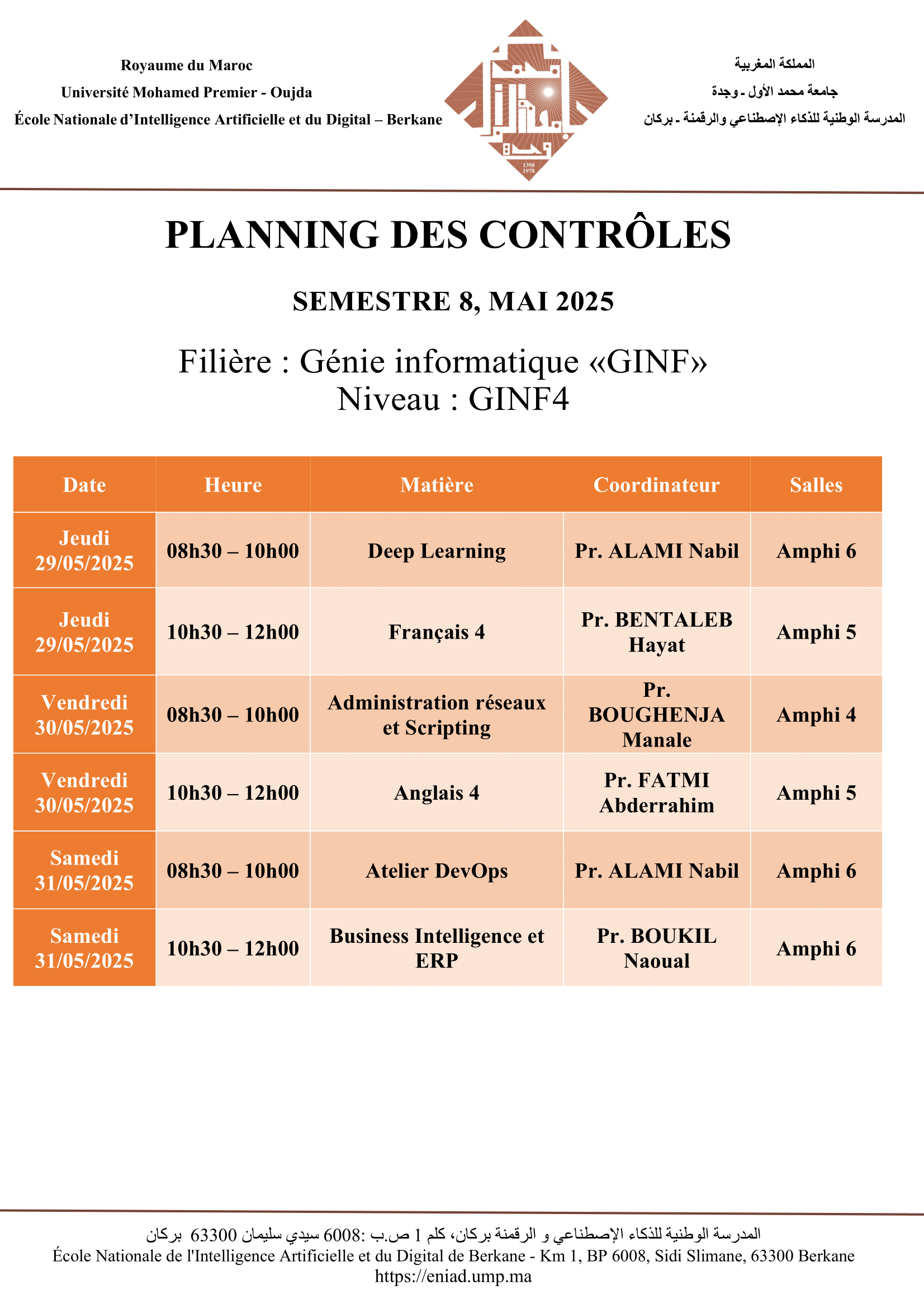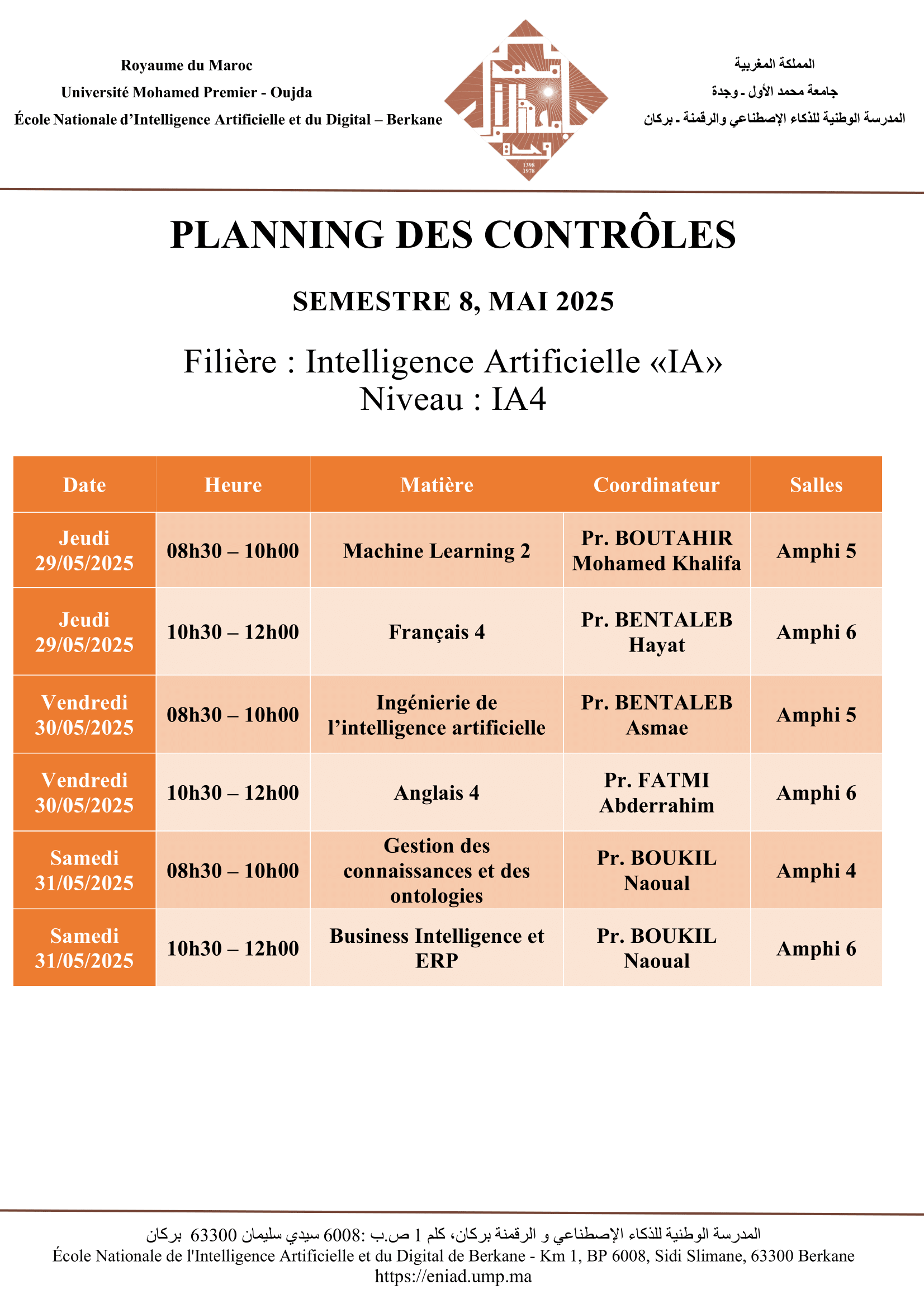 Le planning détaillé ci-dessous indique les dates et heures des contrôles fin des semestres S6 & S8 mois Mois 2025.