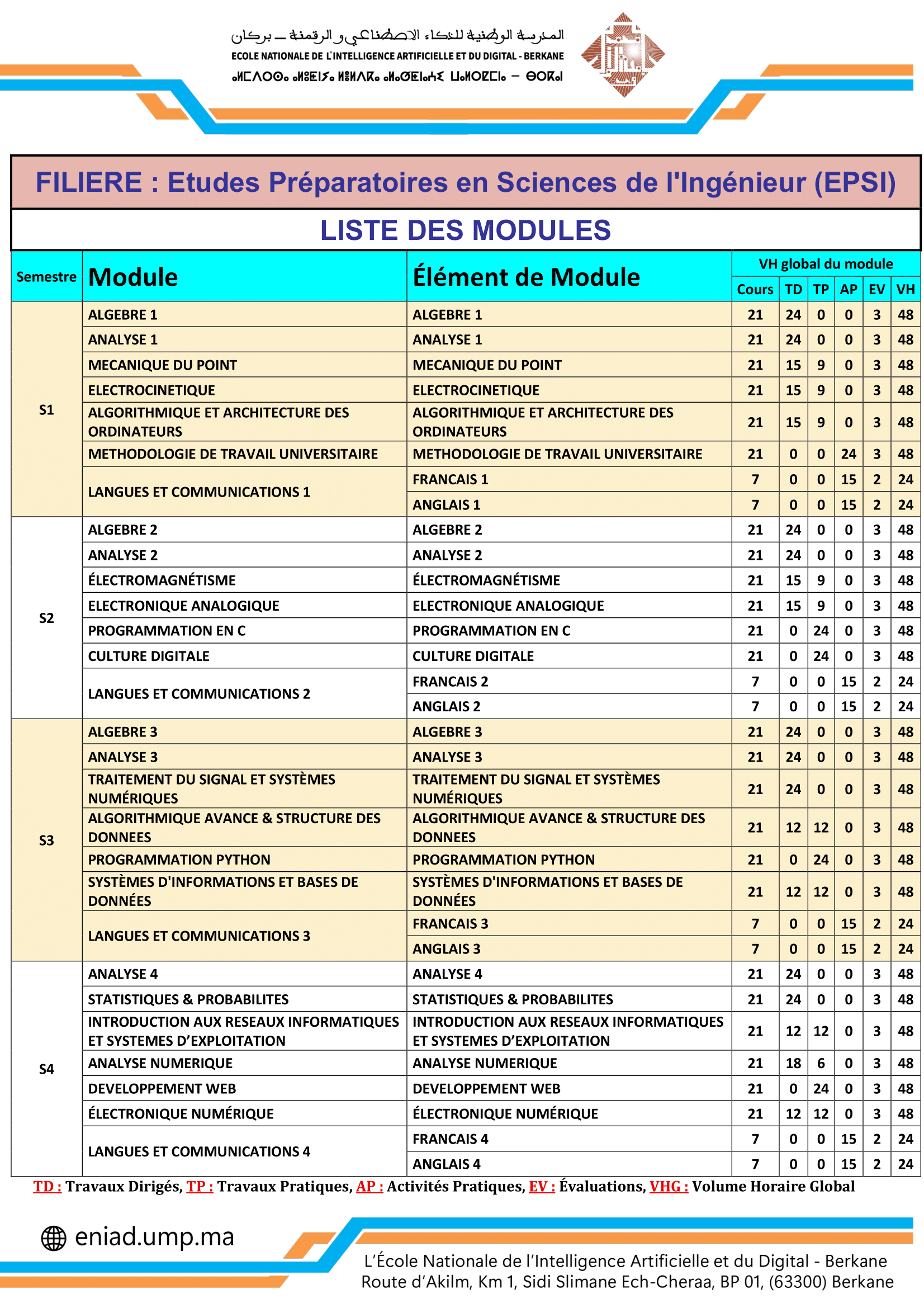 Modules de la filière "Etudes Préparatoires en Sciences de l'Ingénieur (EPSI)"