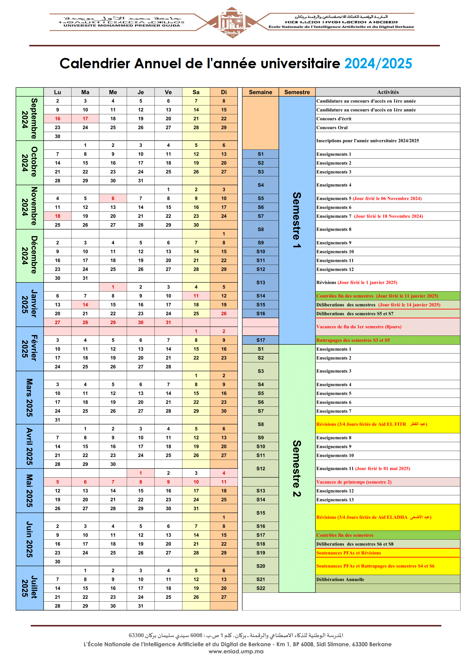 CALENDRIER ANNUEL DE L'ANNÉE UNIVERSITAIRE 2024/2025 |